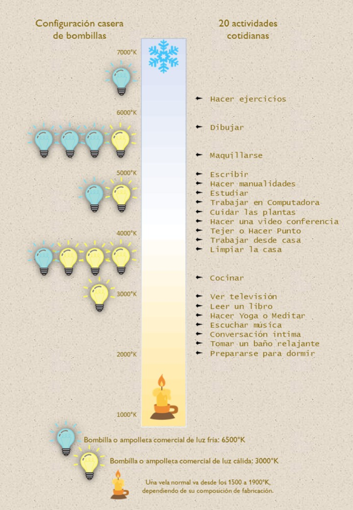 A partir de todas estas observaciones armé una pequeña guía que ahora uso para organizar mi propia casa. Y para visualizarla mejor, incluso hice una ilustración con la escala de luminiscencia, mostrando cómo se mezclan las bombillas de 3000°K (cálida) y 6500°K (fría) para crear tonos intermedios y, lo mejor de todo, cómo se relacionan con cada actividad cotidiana.
